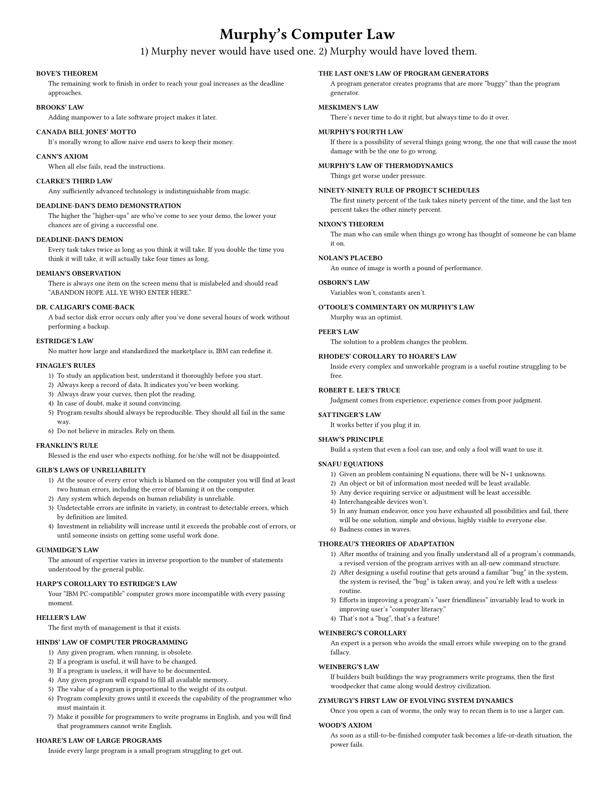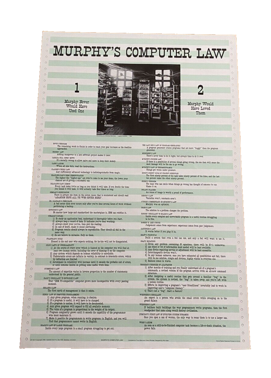 Some of these do feel a little archaic. But it's been four decades, and while many things have changed, it seems many things have stayed the same. Last year I started my own collection of more recent programming aphorisms that I like. Maybe someday I'll make my own poster. For now, please communicate *your* favorite computer law with me telepathically. ♦︎